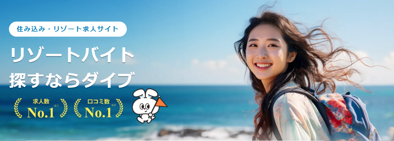 ダイブは、全国のリゾート地に住み込みで働ける「リゾートバイト」を紹介している人材サービスで、2002年のサービス開始以来、累計30万人以上の紹介実績を誇る業界大手の派遣会社です。長年の運営実績に加え、上場企業としての信頼性もあり、初めてのリゾートバイトでも安心して利用できる環境が整っています。