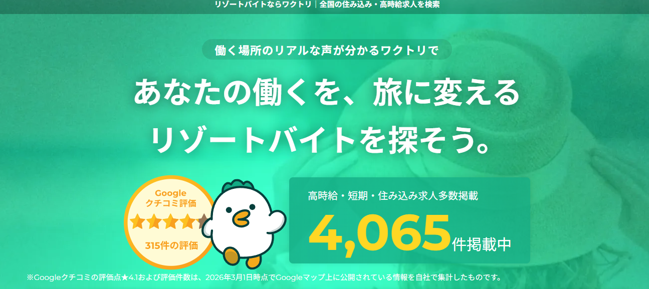 ワクトリは、「気軽に・スピーディーにリゾートバイトを始めたい」という方におすすめのサービスです。LINE中心のやり取りでストレスなく進められる点は、特に学生にとって大きなメリットといえます。ただし、求人数やサポートの安定感では上位サービスに一歩及ばないため、「初めてで不安」「しっかりサポートしてほしい」という場合はダイブを選ぶ方が安心です。スピード重視の方には適した選択肢です。